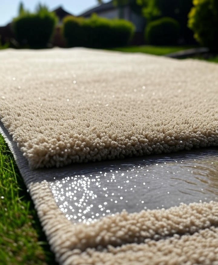 Bawa karpet ke luar rumah, lalu bilas dengan air mengalir. Aliran air yang deras mengangkat lumpur dan kotoran lebih cepat dibanding merendam karpet.